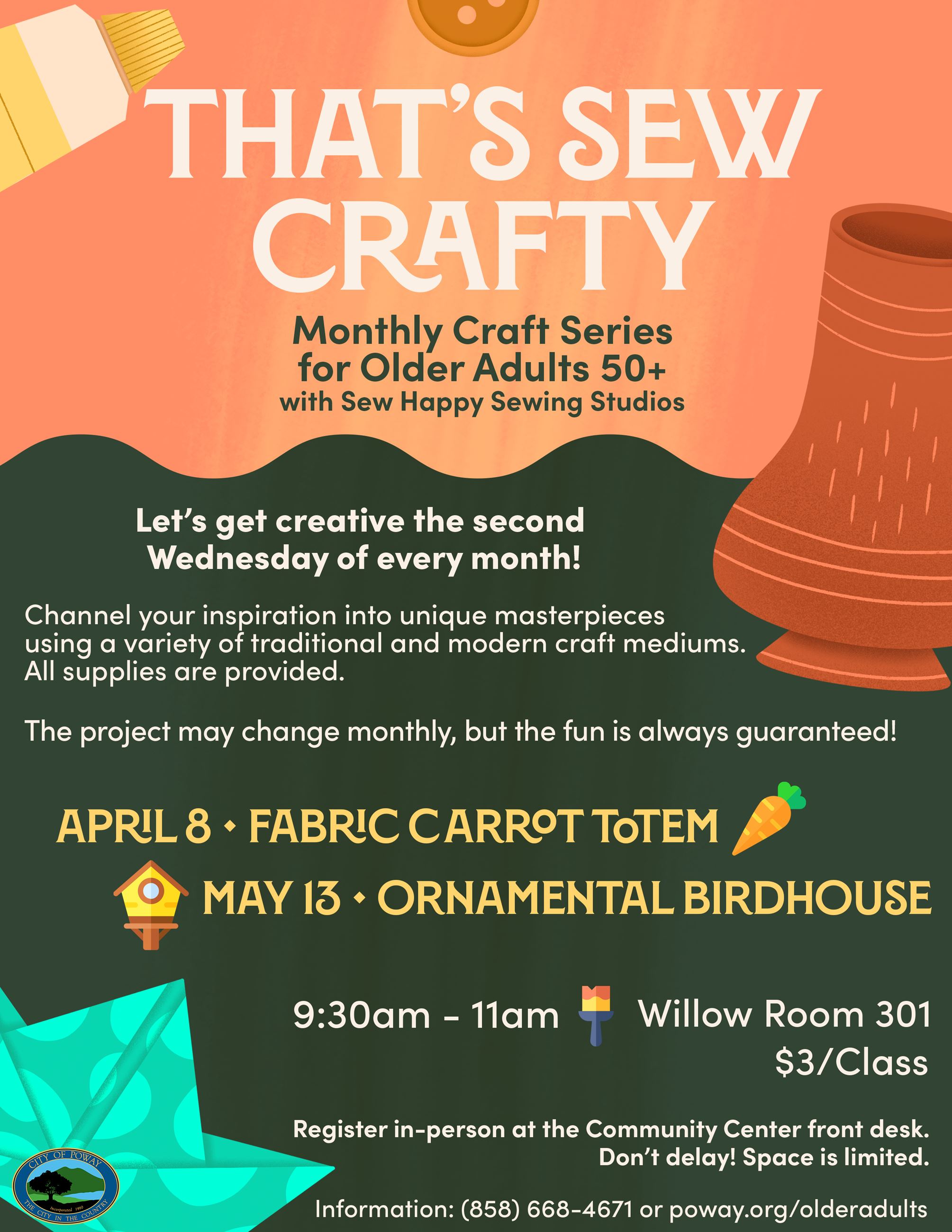Join us April 8 as we craft a quirky fabric carrot totem and May 13 for a charming ornamental birdhouse!