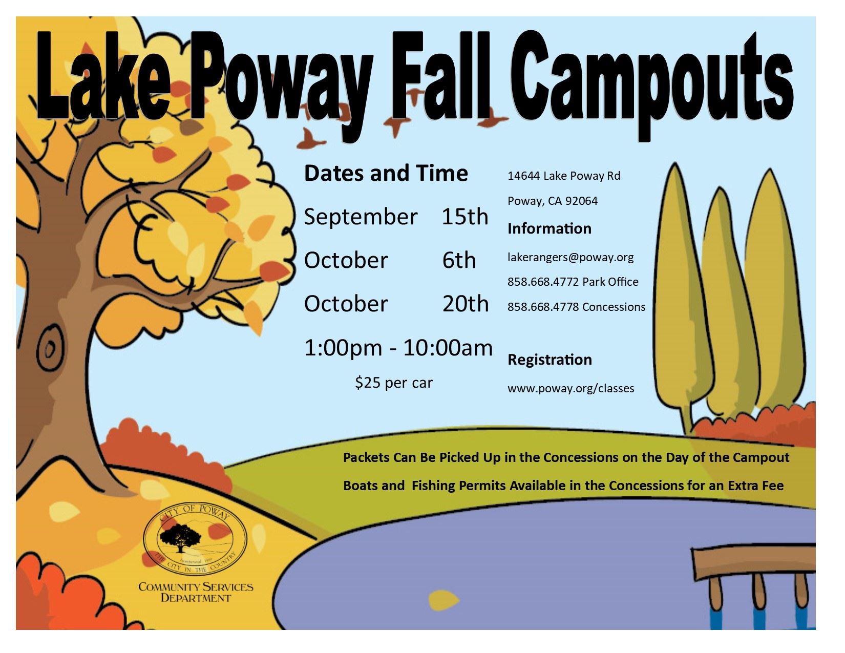 In October we have our Fall Camping Series. Camping will be available the nights of October 6th and 20th. The fee is only $25 for up to 5 people. People registered for the campout can fish all night if they buy a fishing permit. For more details check our website: